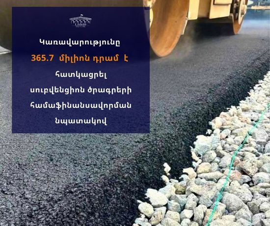 ՀՀ կառավարության դեկտեմբերի 18-ի նիստում 365.7 միլիոն դրամ է հատկացվել Լոռու մարզին՝ ենթակառուցվածքների զարգացմանն ուղղված 9 սուբվենցիոն ծրագրերի համաֆինանսավորման նպատակով